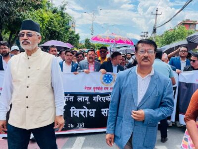 नेपाल सुनचाँदी व्यवसायी महासंघ,रत्न आभूषण महासंघ र नेपाल सुृनचाँदी व्यवसायी तथा कालिगढ संघर्ष समितिको संयुक्त आयोजनामा भएको विरोध कार्यक्रममा उपत्यका तथा जिल्ला वाहिरका गरी हजारौं व्यवसायी,कालिगढ तथा कर्मचारीहरुको सहभागिता रहेको थियो । करिव एक महिना देखि अनिश्चितकालिन पसल वन्द गरेर निरन्तर विरोधमा उत्रिएका सुन व्यवसायीहरुले सुनलाई विलासी वस्तुबाट हटाउनुपर्ने,सुनचाँदी नीति ल्याईनुपर्ने र सुनको कोटा खारेज गर्नुपर्ने माग उठाएका छन् ।