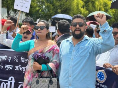 २६ असार- काठमाडौं,  सुनमा लगाइएको विलासी कर र भ्याटको विरुद्धमा सुनचाँदी व्यवसायीहरुले विहिवार माईतीघरमा विरोध प्रर्दशन गरेका छन ।